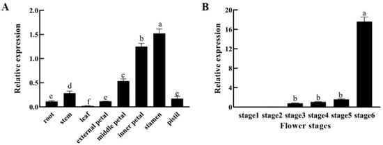 Expression patterns of CpSRG1 in wintersweet. (A) Relative expression of CpSRG1 gene in different tissues of wintersweet. (B) Expression of the CpSRG1 gene at different flower stages of wintersweet. Stage 1 (sprout period); stage 2 (flower-bud period); stage 3 (petal-display period); stage 4 (initiation of bloom period); stage 5 (bloom period); stage 6 (withering period). CpActin and CpTublin were used as an internal control. Data represent the mean of three biological repeats ± SEM. Error bars indicate the standard error of the mean. Different lowercase letters (a–f) on bars indicate significant differences (p < 0.05).