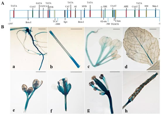 Diagram and the tissue-specific GUS activity of CpSRG1 promoter. (A). A diagram of the promoter region of CpSRG1 with potential cis-elements binding sites. (B). Tissue-specific GUS activity under the control of the CpSRG1 promoter (a) roots, (b) stem, (c) young leaves, (d) senescing leaves, (e) young flowers, (f) senescing flower, (g) column, (h) silique. Bars denote 2 mm.