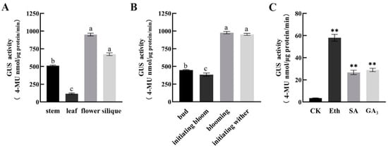 To understand the effects of different treatments on the GUS gene driven by the CpSRG1 promoter in Arabidopsis, fifteen-day-old homozygous Arabidopsis T3 seedlings were treated with 50 µM Eth (ethylene), 100 µM SA (salicylic acid) and 100 µM GA3 (gibberellin) for 12 h, respectively [,,]. Seedlings grown under normal conditions were used as controls. These samples were then used for GUS activity analysis. Each experiment contained three biological replicates.