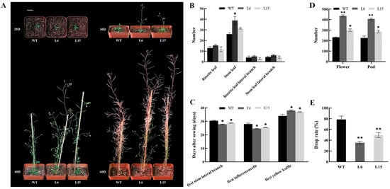 Morphological phenotype analysis of CpSRG1 transgenic plants. (A) CpSRG1 transgenic Arabidopsis at different stages under normal growth condition. The pictures were taken 20, 30, 40 and 60 days after sowing. Bar denotes 2 cm. (B) Number of leaf and branch. (C) The day of the first stem collateral branch, the first inflorescence and the first yellow leaf. (D) Number of flower and silique. (E) Drop rate. WT (wild-type plants, Col-0); L6 & L5, transgenic plants overexpressed CpSRG1. Data represent mean of three biological repeats ± SEM. Error bars indicate the standard error of mean. Asterisks denote statistically significant differences compared with control, * p < 0.05, ** p < 0.01.