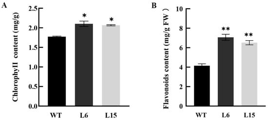 The chlorophyll and flavonoid content of leaves in CpSRG1 transgenic and wild-type Arabidopsis. (A) chlorophyll content. (B) flavonoid content. WT (wild-type plants, Col-0); L6 & L5, transgenic plants overexpressed CpSRG1. Data represent mean of three biological repeats ± SEM. Error bars indicate the standard error of mean. Asterisks denote statistically significant differences compared with control, * p < 0.05, ** p < 0.01.