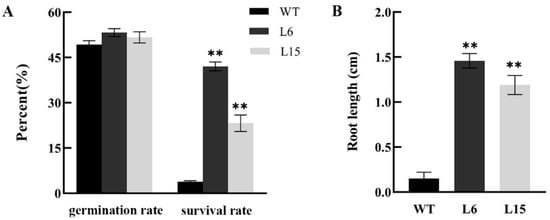 To further investigate the function of CpSRG1, we transformed the CpSRG1 gene into Arabidopsis. Transgenic lines were obtained through hygromycin selection, and the expression level of CpSRG1 was confirmed by qRT-PCR. Two homozygous T3 transgenic lines (L6 and L15) with high and medium expression levels were selected for phenotypic analysis, and wild-type plants (WT) were used as a control.