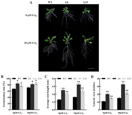 Effects comparison of GA3 treatment on CpSRG1 transgenic and wild-type Arabidopsis. (A) The phenotype of fifteen-day-old plants under GA3 treatment. Bar denotes 1 cm. (B) Germination rate. (C) Average root length. (D) lateral root number. WT (wild-type plants, Col-0); L6 & L5, transgenic plants overexpressed CpSRG1. Data represent mean of three biological repeats ± SEM. Error bars indicate the standard error of mean. Asterisks denote statistically significant differences compared with control, * p < 0.05, ** p < 0.01.