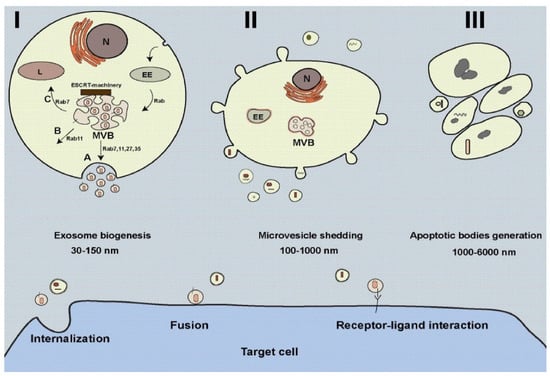 | Exosomes | 30–150 nm | CD9, CD63, CD81, Tsg101 | Generated from MVBs through ESCRT-dependent or/and ESCRT-independent mechanism and secreted out of cells upon fusion of MVBs with the plasma membrane |