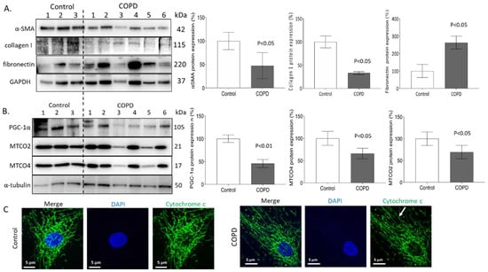 CSE modulates remodeling and induces mitochondria fragmentation in ASMCs. (A) Representative Western blots and image analysis of α-SMA, collagen type-I, and fibronectin protein expressions of ASMCs of control and COPD patients. GAPDH (glyceraldehyde 3-phosphate dehydrogenase) served as house-keeping protein; p < 0.05 was considered significant. (B) Representative Western blots and image analysis of MTCO2, MTCO4, and PGC-1α protein by ASMCs of control and COPD patients; tubulin was used as reference protein and p < 0.05 was considered as significant. Statistics were calculated by Student’s t-test. (C) Mitochondria morphology in ASMCs of control and COPD patients by confocal microscopy (60×, green: cytochrome C, blue: DAPI (4’,6-diamidin-2-phenylindol), white arrow indicates fragmented mitochondria).