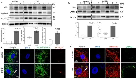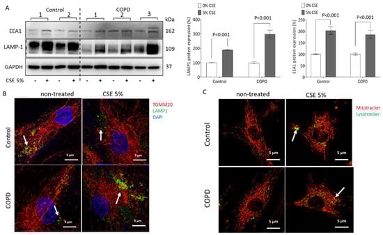 In Figure 2C, protein analysis by Western blot showed that the expression of early endosome antigen 1 (EEA1) and lysosomal-associated membrane protein 1 (LAMP-1) were both significantly increased in ASMCs of COPD patients (481.7% and 302.9%, respectively), when compared to control cells. The increased expression of LAMP-1 in ASMCs of COPD patients co-localized with damaged mitochondria is shown by co-staining (Figure 2D, white arrow). The concentration-dependent effect of CSE on the two proteins is shown in Figure S1B.