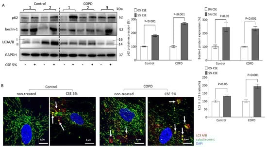 The expression of different autophagy markers in ASMCs obtained from COPD patients was significantly increased when compared to cells of controls. As shown by representative Western blots in Figure 2A, ASMCs of COPD patients showed a higher expression of p62 (481.8%) and Beclin-1 (285.3%), as well as an increased ratio of LC3A/B II to LC3A/B I (198.2%) when compared with the control. The latter was confirmed by immunofluorescence co-staining, with increased LC3A/B II in COPD cells, and its co-localization with cytochrome C, indicating increased mitophagy in ASMCs of COPD patients (Figure 2B). The concentration-dependent effect of CSE on the three proteins is shown in Figure S1B.
