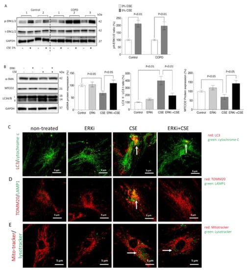 CSE activates ASMC remodeling, mitochondria activity, and mitophagy through ERK1/2. (A) Representative Western blots and image analysis of CSE-induced ERK1/2 phosphorylation. GAPDH served as a reference protein and p < 0.05 was considered significant. (B) Representative Western blots of α-SMA, MTCO2, and LC3A/B protein expression. GAPDH served as a reference protein and p < 0.05 was considered significant. (C–E) Representative confocal microscopy of mitochondria–LC3 co-localization (white arrow). (D) Mitochondria–lysosome co-localization (white arrow). (E) Live-cell imaging of mitochondria–lysosome co-localization (white arrow) after CSE-stimulation. (60×). Statistics were calculated by Mann–Whitney U-test.