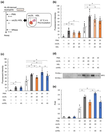 HDL attenuates the oxLDL-enhanced NET formation of HL-60-derived neutrophils. (a) Experimental scheme. OxLDL was pre-incubated with native HDL or oxHDL at 37 °C for 4 h, before being added to the cells. HL-60 cells were differentiated into neutrophil-like cells using 2 μM AtRA treated with or without 20 nM PMA for 30 min, and then treated with lipoproteins for 2 h. The medium was treated with 1 U/mL MNase for 10 min in order to cleave the DNA into short segments. The fluorescence intensity of the medium supernatant was then measured using 1 μM SYTOX® Green. (b) Effect of native HDL on oxLDL-mediated NET formation. OxLDL (20 μg/mL) was pre-incubated without HDL or with 20 or 40 μg/mL HDL for 4 h, following which the lipoproteins were added to the neutrophils for 2 h. The data represent the mean ± SD of four experiments, each carried out in triplicate; each dot represents one data point. (c) Effect of oxHDL on oxLDL-mediated NET formation. Cells primed using PMA were incubated with 20 μg/mL oxLDL in the presence of 40 μg/mL native HDL or oxHDL for 2 h. In addition, some cells were incubated with oxHDL alone, for 2 h. The data represent the mean ± SD from three experiments, each carried out in triplicate. (d,e) The MPO released in the medium was detected using Western blot in aliquots of the culture supernatant obtained in (c). A representative Western blot (d) and its quantification using ImageJ software (e) have been shown. The data are shown as the relative value to the band intensity of the control sample (no lipoprotein after PMA treatment). The data from three runs are shown. Asterisks indicate statistical significance (* p < 0.05), while sharps indicate statistical significance against the corresponding conditions without PMA (# p < 0.05). HDL, high-density lipoprotein; NETs, neutrophil extracellular traps; oxLDL, copper-oxidized low-density lipoprotein; oxHDL, copper-oxidized high-density lipoprotein; AtRA, all-trans retinoic acid; PMA, phorbol 12-myristate 13-acetate; MNase, micrococcal nuclease; MPO, myeloperoxidase.