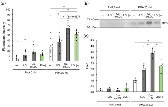 Next, MPO released from the cells into the culture medium was evaluated using Western blot (Figure 2b,c). The MPO released into the medium upon the addition of LDL(–) was significantly increased by more than 2-fold as compared to that observed upon PMA treatment alone, while it was less than that observed upon addition of oxLDL. These results indicate that LDL(–) has the ability to promote NET formation induced by PMA treatment, although the effect of LDL(–) was slightly milder than that of copper-induced oxLDL. It is likely that the difference in the oxidation products generated by oxLDL and LDL(–) may correlate with the difference in their NET-promoting abilities.