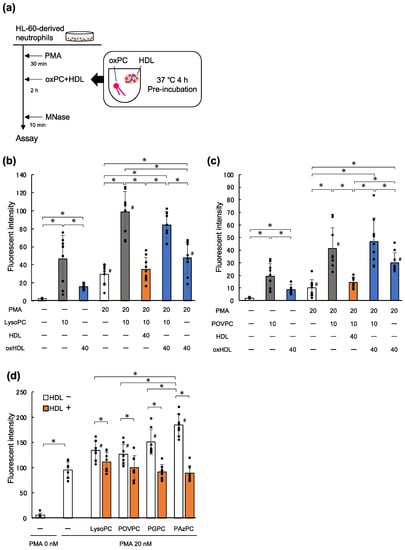 HDL inhibits enhancement of NET formation by lysoPC and oxPCs. (a) Experimental scheme. LysoPC or oxPCs were pre-incubated with or without 40 μg/mL HDL or oxHDL at 37 °C for 4 h. (b,c) Either 10 μM lysoPC (b) or POVPC (c) were added to the PMA-primed neutrophils in order to enhance NET formation. The data represent the mean ± SD from four experiments, each carried out in triplicate; each dot represents one datapoint. Asterisks indicate statistical significance (* p < 0.05), while sharps indicate statistical significance against the corresponding conditions without PMA (# p < 0.05). (d) Similarly, HL-60 derived neutrophil-like cells were stimulated with PMA. Following that, each phospholipid (lysoPC, POVPC, PGPC, or PAzPC; final concentration of 10 μM), with or without 40 μg/mL native HDL, was added to the cells, and the cells were incubated with them for 2 h. The data represent the mean ± SD from four experiments, each carried out with duplicates; each dot represents one datapoint. Asterisks indicate statistical significance (* p < 0.05), while sharps indicate statistical significance against cells treated with 20 nM PMA alone (# p < 0.05). HDL, high-density lipoprotein; NET, neutrophil extracellular trap; lysoPC, lysophosphatidylcholine; oxPCs, oxidized phosphatidylcholines; oxHDL, oxidized high-density lipoprotein; POVPC, 1-palmitoyl-2-(5-oxovaleroyl)-phosphatidylcholine; PMA, phorbol 12-myristate 13-acetate; PGPC, 1-palmitoyl-2-glutaryl-phosphatidyl-choline; PAzPC, 1-palmitoyl-2-azelaoyl phosphatidylcholine.