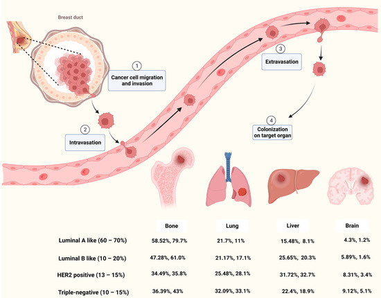 Metastasis occurs frequently and accounts for as much as 90% of cancer-related deaths [13]. Breast cancer metastasis is also frequently diagnosed and exhibits organ tropism to lung, brain, bone and liver, which is highly heterogeneous and affects treatment outcomes and patient prognosis [14]. As shown in Figure 1, breast cancer patients are most prone to bone metastasis, accounting for 50.7−68.8% of all metastatic cases with different molecular subtypes. The lung and liver were similar, with 16.0−23.9% and 13.3−19.7% of breast cancer metastasis occurring in the lung or liver, respectively. The incidence of brain metastasis is approximately 1.9−5.7% of all metastatic cases. Based on molecular subtypes, lung metastasis most commonly occurs in TNBC, accounting for about 32% of patients with metastasis, while the HER2-positive subtype is likely to have liver metastasis [15,16].
