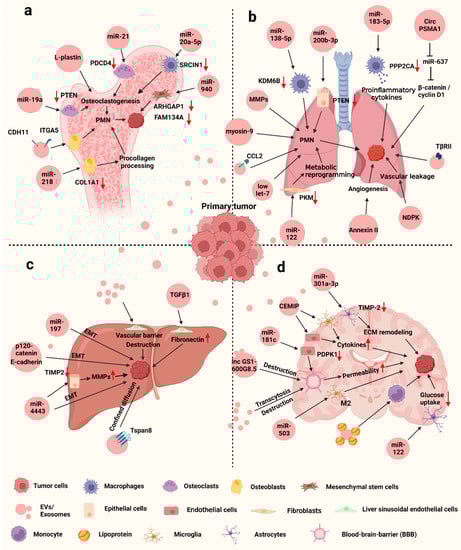 Cancer metastasis is a complicated process that goes through multiple steps such as invasion, intravasation, extravasation and colonization on target organ (Figure 1). Metastasis of tumor cells to distant organs requires not only tumor cell invasiveness, but also a microenvironment that is conducive to tumor survival and proliferation in secondary organs [17]. Although the molecular mechanisms of breast cancer metastasis are not fully understood, mounting studies have shown that primary cancer cells could secrete factors to remodel the microenvironment of the target organ and prime it into a site favorable for cancer cell proliferation, known as pre-metastatic niche (PMN) [18,19,20]. Among these factors, EVs secreted by cancer cells play important roles in microenvironment remodeling and metastatic organotropism [21].