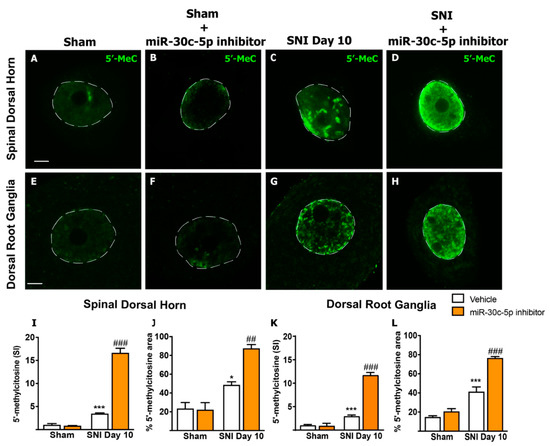 As shown in Figure 1 and Figure S2, the nuclei of SDH and DRG neurons from sham rats treated with either miR-30c-5p-inhibitor or random anti-miR exhibited similarly low 5′-MeC immunoreactive signals (Figure 1A,B,E,F). Importantly, both the 5′-MeC mean signal intensity (SDH: sham + random anti-miR (0.99 ± 0.3, n = 2) vs. 10 days-SNI + random anti-miR (3.42 ± 0.18, n = 3) p < 0.001; 10 days-SNI + miR-30c-5p-inhibitor (16.61 ± 1.02, n = 3) vs. 10 days-SNI + random anti-miR (3.42 ± 0.18, n = 3) p < 0.001, and DRG: sham + random anti-miR (0.99 ± 0.19, n = 3) vs. 10 days-SNI + random anti-miR (2.93 ± 0.27, n = 3) p < 0.001; 10 days-SNI + miR-30c-5p-inhibitor (11.69 ± 0.59, n = 3) vs. 10 days-SNI + random anti-miR (2.93 ± 0.27, n = 3) p < 0.001) and the percentage of the nuclear area immunolabeled (SDH: sham + random anti-miR (23.26 ± 6.64, n = 2) vs. 10 days-SNI + random anti-miR (48.43 ± 3.5, n = 3) p < 0.01; 10 days-SNI + miR-30c-5p-inhibitor (87.34 ± 4.2, n = 3) vs. 10 days-SNI + random anti-miR (48.43 ± 3.5, n = 3) p < 0.01, and DRG: sham + random anti-miR (14.66 ± 1.43, n = 3) vs. 10 days-SNI + random anti-miR (41.19 ± 5.03, n = 3) p < 0.001; 10 days-SNI + miR-30c-5p-inhibitor (76.45 ± 3.07, n = 3) vs. 10 days-SNI + random anti-miR (41.19 ± 5.03, n = 3) p < 0.001) increased significantly after SNI and were even stronger in SNI rats treated with miR-30c-5p-inhibitor (Figure 1C,D,G–L).