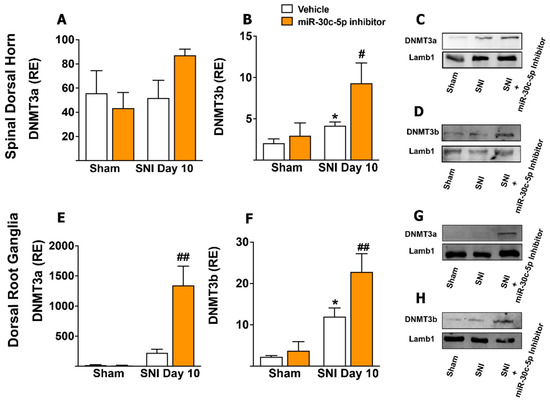 Effects of the treatment with miR-30c-5p inhibitor on the expression of de novo DNA methyltransferases in the dorsal root ganglia and spinal dorsal horns from rats subjected to sciatic nerve injury. The mRNA relative expression (RE) of DNMT3a and DNMT3b determined by qPCR and normalised to 18S in the lumbar spinal dorsal horn (SDH) (A,B) and dorsal root ganglia (DRG) (E,F) from sham rats treated with random anti-miR (n = 6), sham rats treated with miR-30c-5p inhibitor (n = 5), SNI rats treated with random anti-miR (n = 8), and SNI rats treated with miR-30c-inhibitor (n = 6). Values are mean ± SEM. * p < 0.05 vs. sham; # p < 0.05, ## p < 0.01, vs. SNI (two-way ANOVA followed by Bonferroni post hoc test). Protein expression levels of DNMT3a, DNMT3b, and the nuclear marker laminin-1β (Lamb1) determined by Western blot in SDH (C,D) and DRG (G,H) lysates from sham rats (n = 2), SNI rats (n = 2), and SNI rats treated with miR-30c-inhibitor (n = 2). * p < 0.05, vs. sham; # p < 0.05, ## p < 0.01 vs. SNI (one-way ANOVA followed by Bonferroni post hoc test).