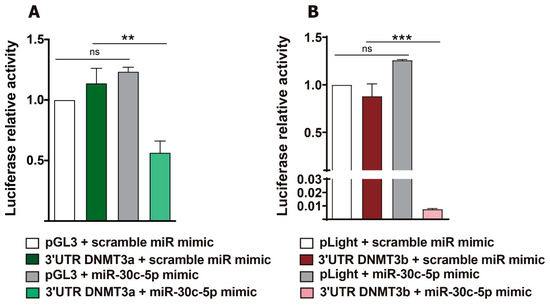 Post-transcriptional regulation of de novo DNMTs by miR-30c-5p in cultured cells. Luciferase reporter assays in HeLa cells co-transfected with pGL3-REPORT luciferase vector (25 ng) containing the 3′UTR of DNMT3a (A) and pLight-REPORT luciferase vector containing the 3′UTR of DNMT3b (B) and miR-30c-5p mimic (10 nM). The data represent the mean ± SEM of the relative luciferase units normalised to the amount of protein in two independent experiments with quintupled measurements.; n.s, not significant, ** p < 0.01, *** p < 0.00 vs. 3’UTR + scramble miR mimic (one-way ANOVA followed by Bonferroni post hoc test).