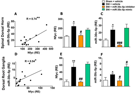 Effects of the treatment with miR-30c-5p inhibitor or miR-30c-5p mimic on the expression of miR-30c-5p and its host gene Nfyc in the spinal dorsal horn and dorsal root ganglia from rats subjected to SNI. (A,D): Linear regression and Pearson′s correlation analyses show the relationship of miR-30c-5p relative expression with Nfyc mRNA levels in the spinal dorsal horn (SDH) and dorsal root ganglia (DRG). r: Pearson′s correlation coefficient. Nfyc mRNA (B,E) and miR-30c (C,F) expression in sham and SNI rats treated with random, miR-30c-5p mimic, or miR-30c-5p inhibitor. (n = 5 rats per group.) Values are mean ± SEM. * p < 0.05, ** p < 0.01 vs. sham; # p < 0.05, ## p < 0.01, ### p < 0.001 vs. SNI (one-way ANOVA followed by Bonferroni post hoc test).