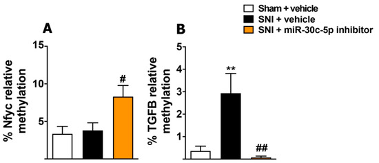 Previous results from our group showed that the anti-inflammatory cytokine TGF-β1 constitutes a direct post-transcriptional target of miR-30c-5p, which mediates the antiallodynic effect of the miR-30c-5p inhibitor in SNI rats [14]. Therefore, we considered it to be of great interest to explore the impact of miR-30c-5p modulation on the epigenetic control of TGF-β1 transcription in SNI rats. As shown in Figure 5B, the percentage of methylation of the TGF-β1 promoter increased significantly in neuropathic SNI rats treated with a random anti-miR (sham + random anti-miR (0.36 ± 0.21, n = 4); 10 days-SNI + random anti-miR (2.93 ± 0.87, n = 3); 10 days-SNI + miR-30c-5p-inhibitor (0.077 ± 0.057, n = 4), p < 0.01), in comparison with sham rats. In contrast, pain-free SNI rats treated with the miR-30c-5p inhibitor showed promoter hypo-methylation, compared to neuropathic SNI rats. Therefore, our results supported that, in addition to its canonical post-transcriptional effects, miR-30c-5p can indirectly regulate the methylation status of the TGF-β1 promoter.