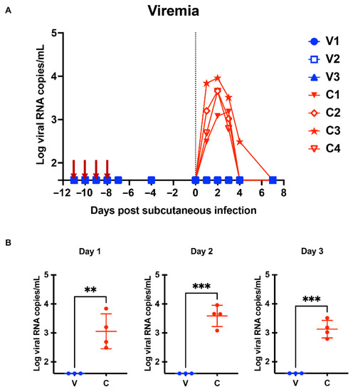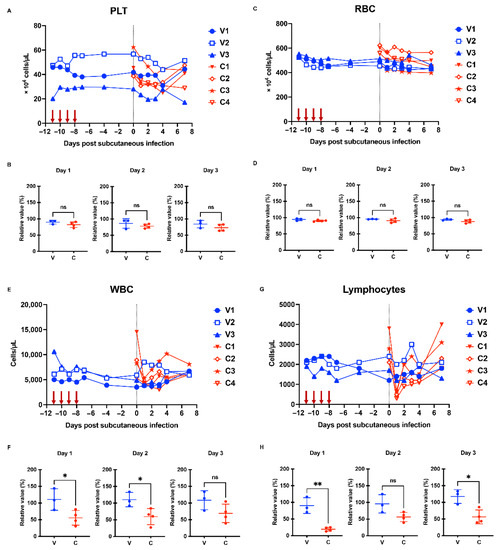 To test whether repeated intravaginal inoculation could induce protective immunity in three monkeys (hereafter referred to as the V group), we subcutaneously challenged these monkeys with the homologous PRVABC59 strain 11 days after the first intravaginal challenge. Four naïve macaques served as the control group (hereafter referred to as the C group) (Figure 1). We monitored the levels of plasma viral RNA load and changes in PLT, RBC, and WBC counts on Days 0, 1, 2, 3, 4, and 7. We observed a peak in viral RNA load between Days 2 and 3 in the C group. Similar to observations in a previous cynomolgus monkey model [29], the maximal viral load for monkeys in the C group was 1.5 × 103–9.1 × 103 genome copies/mL (Figure 2A). In sharp contrast, none of the monkeys in the V group showed detectable viremia (Figure 2A,B). Although we observed comparable changes in RBC between the V and C groups (Figure 3C,D), the C group tended to have a lower PLT level than the V group (Figure 3A,B). Notably, the C group had significantly lower WBC counts than the V group on Days 1 and 2 (Figure 3E,F). The C group showed a more significant decline in lymphocytes than the V group on Days 1 and 3 (Figure 3G,H). Flow cytometric analysis demonstrated that the decline in lymphocytes is associated with a rapid loss of T cell subsets (CD3+, CD16− population) (Supplementary Figure S1). Furthermore, the C group exhibited apparent changes in the skin (Figure 4). We did not observe such changes in group V. We did not observe significant changes of body weight in both groups (Supplementary Figure S2A,B). Collectively, macaques in the V group were protected from the subcutaneous superchallenge.