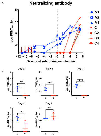 Monkeys in the V group developed a potent neutralizing antibody at the time of subcutaneous superchallenge. (A) The focus reduction neutralization test (FRNT)50 titers were calculated. While V1-V3 denotes each animal ID in group V (intravaginal pre-inoculation), C1-C4 denotes one in group C (control). (B) Differences in FRNT50 titers on Days 0, 1, 2, 4, and 7 between groups V and C were examined by a two-tailed, unpaired Student t-test. **** p < 0.0001, *** p < 0.001, ** p < 0.01, * p < 0.05, ns (not significant).