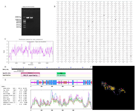 Cloning and bioinformatics analysis of PoVIN3. (A) PCR amplified product of PoVIN3, and M means DNA maker DL2000. (B) Nucleotide sequence and its encoded amino acid sequence. (C) Hydrophilic analysis of PoVIN3−encoded protein. (D) Analysis of conserved domain of PoVIN3. (E) Secondary structure prediction of PoVIN3−encoded protein. (F). Tertiary structure prediction of PoVIN3−encoded protein.