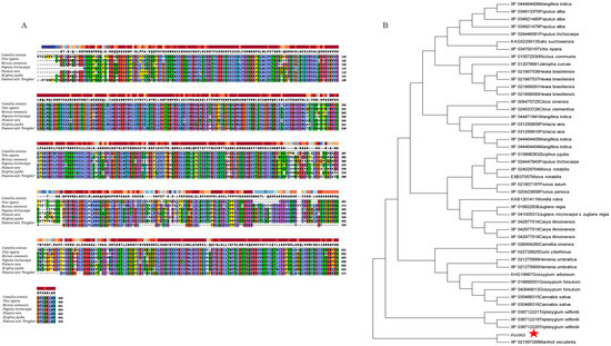 Multiple sequence alignment (A) and phylogenetic relationship (B) of PoVIN3−encoded protein and VIN3−encoded protein from other plant species. The red asterisk represented the PoVIN3−encoded protein.
