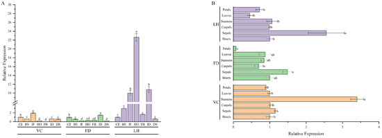 PoVIN3 was expressed in all tissues collected from the three tree peony cultivars, including bracts, sepals, carpels, stamens, leaves, and petals. However, the expression level in the leaves of FD was at the lower limits of detection (Figure 3B). Moreover, the expression levels of PoVIN3 were significantly higher in the sepals of FD and LH across all tissue samples (p < 0.05) (Figure 3B). It is worth noting that the expression of PoVIN3 in VC of early flowering tree peonies was mainly concentrated in stamens, while the lowest expression level was found in petals (Figure 3B).
