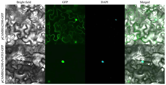 Prediction of subcellular localization suggested that PoVIN3−encoded protein was localized in the nucleus. A fusion expression vector pCAMBIA2300−PoVIN3−GFP was transiently transformed in N. benthamiana to determine the subcellular localization of PoVIN3−encoded protein, while the pCAMBIA2300−GFP was a control. Subsequently, confocal scanning microscopy was used to observe the Agrobacterium tumefaciens−infected leaves of N. benthamiana containing the gene of interest. This study found that the pCAMBIA2300−GFP emitted green fluorescence throughout the cells under the excitation of 488 nm wavelength, while the strong fluorescence signals were distributed in the nucleus for the pCAMBIA2300−PoVIN3−GFP, consistent with the prediction. Thus, indicating that PoVIN3 was indeed nuclearly localized (Figure 4).