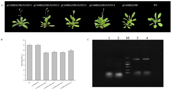 The spatiotemporal expression pattern of PoVIN3 suggested that it might play a key role in the regulation of flowering time and flower development in plants. To prove that PoVIN3 can promote the early flowering of Arabidopsis thaliana, four groups of transgenic Arabidopsis thaliana plants over-expressing pCAMBIA2300−PoVIN3−1, pCAMBIA2300−PoVIN3−2, pCAMBIA2300−PoVIN3−3, and pCAMBIA2300−PoVIN3−4, respectively, were generated (Figure 5A). All four groups of transgenic plants showed an early flowering phenotype compared with the control plants transformed with an empty vector and WT plants, and the flowering time was significantly advanced by 5.67–7.67 days (p < 0.05) (Figure 5B). At the same time, 40−day−old leaves of T2 plants were harvested, and the results of RT−PCR analysis of PoVIN3 also proved that the transgenic lines obtained specific amplified bands of the expected size; by contrast, no specific bands were detected in either WT or pCAMBIA2300 plants (Figure 5C). These results suggest that PoVIN3 plays an important role in the flowering process of plants under long-day conditions.