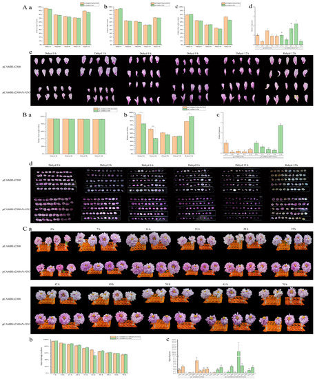 The effects of gene overexpression and dehydration were also tested on petal discs. In the process of dehydration, the relative fresh weight of petal discs infected with the pCAMBIA2300−PoVIN3 overexpression vector was slightly higher than that infected with pCAMBIA2300 empty vector, but there was no significant difference (p > 0.05) (Figure 6B(a,d)). Moreover, this phenomenon was also confirmed by the relative area (Figure 6B(b,d)). However, after 12h of rehydration, petal discs infected with pCAMBIA2300 empty vector could recover to 91.02% ± 0.73% of their initial value, which was significantly higher than that infected with overexpressed bacteria (p < 0.05) (Figure 6B(b)). The relative expression of PoVIN3 in the overexpressed infected petal discs during dehydration was higher than that in the empty vector control and reached the peak at 12 h after dehydration (Figure 6B(c)).