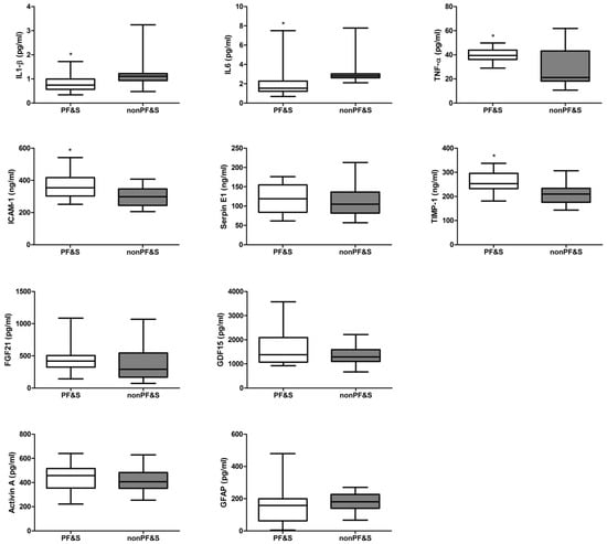 Serum levels of the inflammatory markers TNF-α (p < 0.05) and those of the SASP-related factors ICAM-1 (p < 0.05) and TIMP-1 (p < 0.001) were found to be higher, while those of IL1-β (p < 0.01) and IL6 (p < 0.01) were lower in participants with PF&S compared with nonPF&S controls (Figure 1, Table S1).