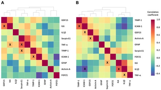Correlation Matrix and Hierarchical Cluster Analysis of Serum Markers in the Two Participant Groups. Panel (A), participants with physical frailty and sarcopenia (PF&S); panel (B), participants without PF&S. Abbreviations: FGF21, fibroblast growth factor 21; GDF15, growth/differentiation factor 15; GFAP, glial fibrillary acidic protein; ICAM-1, intercellular adhesion molecule 1; IL, interleukin; TIMP-1, tissue inhibitor matrix metalloproteinase 1; TNF-α, tumor necrosis factor-α; X indicates significant associations (p < 0.05).