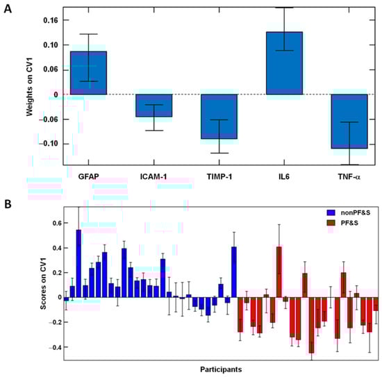 An additional classification model was built on the reduced subset of relevant circulating markers (Figure 3A). The model provided an overall 74.0 ± 3.4% classification accuracy on the outer loop samples (75.0 ± 4.9% for PF&S; 72.8 ± 4.7% for nonPF&S). The good discrimination between the two participant groups can be appreciated graphically in Figure 3B, where the projection of outer DCV loop samples onto the only canonical variate of the model is depicted. The figure allows for appreciating that most PF&S participants fall at negative values of the component, while most nonPF&S participants have positive scores.