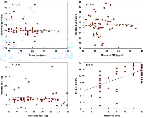 Finally, multivariate regression models using kernel PLS were built to explore the relationship between circulating markers and participant age, BMI, aLM, and SPPB scores (Figure 4). Models were validated by DCV, with 10 and eight cancelation groups in the outer and inner loops, respectively. Models for the prediction of age, BMI, and aLM had R2 values close to 0, indicating the absence of a significant relationship between the analyzed variables. A higher R2 value (0.31), though still relatively low, was obtained for the model relating the circulating markers to SPPB scores.