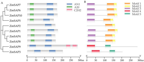 The CDD analysis and sequence alignments showed that seven ZmSAPs, including ZmSAP1, ZmSAP4, ZmSAP5, ZmSAP6, ZmSAP7, ZmSAP8 and ZmSAP10, had an A20 domain at the N terminus and an AN1 domain at the C terminus, respectively. Only ZmSAP2 possessed a single AN1 domain at the N terminus. ZmSAP3 and ZmSAP9 both contained two AN1 domains without an A20 domain. Moreover, ZmSAP9 had two C2H2 domains (Figure 1A and Figure S1). Meanwhile, to explore the conserved motifs of ZmSAPs, these amino acid sequences were analyzed using the MEME tool. The results showed that ZmSAPs exhibited similar motif composition (Figure 1B). Among them, motif 1 and motif 3 were highly conserved and contributed to the A20 and AN1 domains of ZmSAP1, ZmSAP2, ZmSAP4, ZmSAP5, ZmSAP6, ZmSAP7, ZmSAP8 and ZmSAP10, respectively. In addition, there was a conserved motif 2 at the N terminus of these eight ZmSAPs behind the AN1 domain. Motif 4 and motif 5 were composed of two AN1 domains of ZmSAP3 and ZmSAP9, respectively.