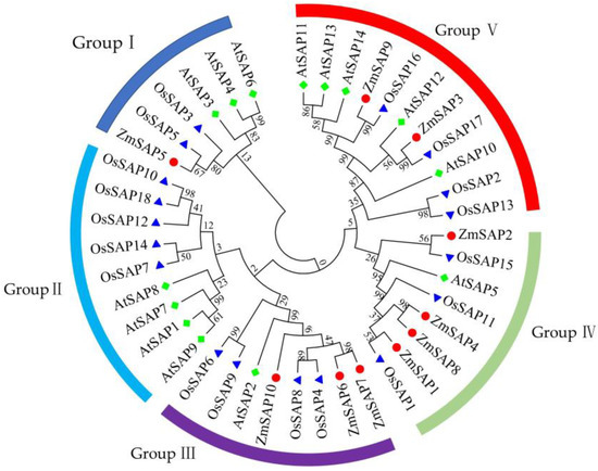 Figure 2. Phylogenetic evolutionary tree of SAP family in maize, Arabidopsis and rice. The red dot indicates the ZmSAP, the blue triangle indicates the OsSAPs, and the green diamond represents the AtSAPs.