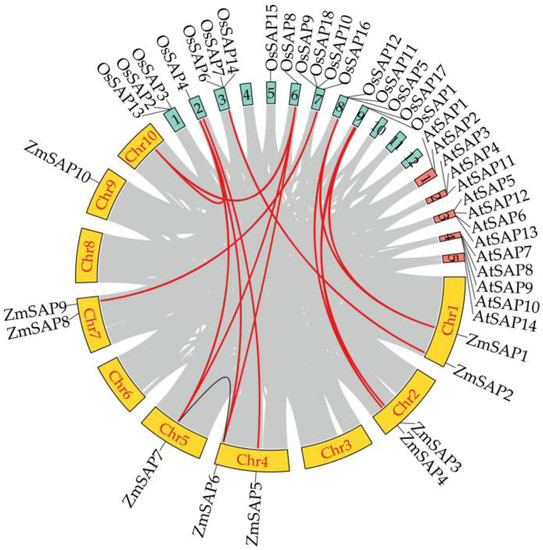 Figure 3. Chromosome localization and collinearity analysis of SAPs in maize. The inner black line represents the paralogous pair of ZmSAPs. The inner red line indicates collinearity within species of SAP genes between maize and rice. The yellow blocks represent 10 chromosomes of maize, the green blocks represent 12 chromosomes of rice, and the red blocks represent 5 chromosomes of Arabidopsis.