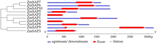 Figure 4. Gene structure of ZmSAPs. The red triangles indicate exons, and the blue boxes indicate 5’ or 3’ UTR, and the black line connecting exons indicates an intron.