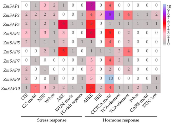 Figure 5. The cis-acting elements ZmSAP promoter region. The numbers in the blocks represent the number of cis-acting elements. LTR—low-temperature response; GC-motif—enhancer-like element involved in anoxic specific inducibility; MBS—(Myb binding site) drought response; ARE—(anaerobic response element) anaerobic induction; TC-rich repeats and W-box—defense and stress response; WUN-motif—wounding response; ABRE (ABA response element)—ABA response; ERE (ethylene response element)—ethylene response; CGTCA-Motif—MeJA response; TC-element—salicylic acid response; TGA-element—auxin response; P-box—GARE-motif and TATC-box—gibberellin response.