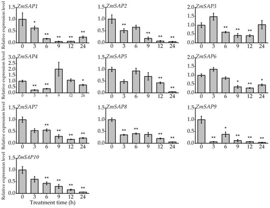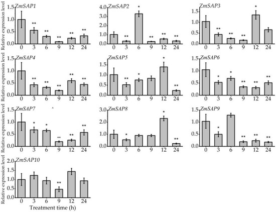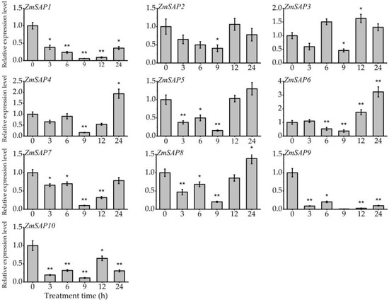 Figure 8. The expression of 10 ZmSAP genes in response to 100 μM ABA treatment. * and **, indicates significant differences at p < 0.05 and p < 0.01, respectively.