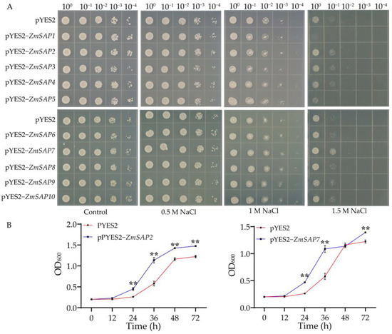 To validate the function of ZmSAPs in osmotic stresses, each ZmSAP gene was heterologously expressed in Saccharomyces cerevisiae W303a cells to phenotype on plates supplemented with mannitol or NaCl. The results showed no significant difference between yeast cells carrying pYES2-ZmSAPs and pYES2 (control) plasmid on the plates with mannitol (Figure S4). As shown in Figure 9A, under the plates without NaCl for control, 0.5 and 1.0 M NaCl, the yeast strain with every ZmSAP gene showed no difference compared to the yeast strain with empty vector pYES2, although the growth of all yeast was slightly inhibited by 1.0 M NaCl. On the plates with 1.5 M NaCl, the growth of yeast was severely inhibited. However, the yeast strains expressing ZmSAP2 and ZmSAP7 showed preferential growth vigor than that of pYES2 and other ZmSAPs. Subsequently, the yeast cells harboring ZmSAP2 and ZmSAP7 were cultured in liquid YNB-Ura-Gal 2% medium supplemented with 1.5 M NaCl and used to measure the growth curves. The results showed that the yeast strains with pYES2-ZmSAP2 and pYES2-ZmSAP7 exhibited a higher growth speed than that of pYES2 after 12 h to 72 h. The OD600 of them was significantly higher than the control. (Figure 9B). These results confirmed that expression of the ZmSAP2 and ZmSAP7 genes provide the yeast with the ability to tolerate saline stress.