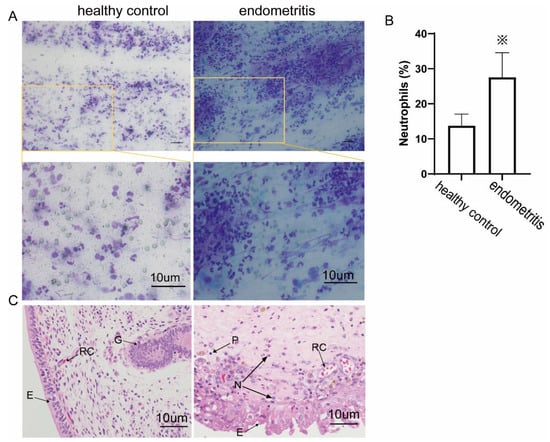 Endometritis-induced neutrophil recruitment in vaginal discharge and endometrial tissue. (A) Diff-Quick staining images of neutrophils in vaginal discharge; lobulated nucleus-shaped cells are neutrophils; black bar = 10 µm. (B) Ratio of neutrophils in vaginal discharge; endometritis group, n = 10; healthy group, n = 4. ※ p < 0.05. (C) Histopathological characteristic images of endometrial biopsy specimens from postpartum cows. E, endometrial epithelium; G, uterine glands; N, neutrophils (lobulated nucleus-shaped cells); RC, red cells; P, plasma cells (deeply stained nuclei, wheel-mounted, with less cytoplasm); 400× magnification.