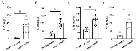 ELISA results from healthy control (n = 4) endometrial tissue and endometritis group (n = 10) endometrial tissue, showing levels of (A) IL-1β, (B) IL-6, (C) IL-18, and (D) TNF-α. Values are presented as mean ± SD. ※ p < 0.05. Black points represent individual data points.