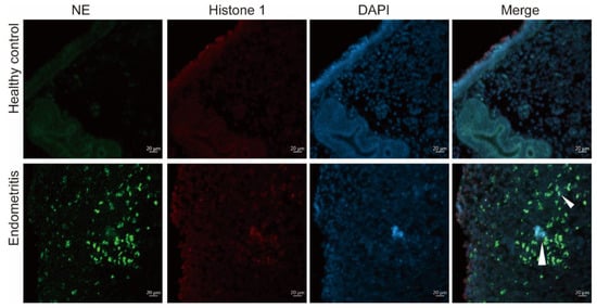 Immunofluorescent staining of NETs was assessed by confocal microscopy in healthy control endometrial tissue and endometritis group endometrial tissue, NE (green), neutrophil elastase; histone 1 (red); DAPI (blue); white arrows indicate neutrophil extracellular traps; white bar = 20 µm; 400× magnification.