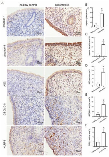 Immunohistochemical staining results of pyroptosis-related proteins in cow uterus. (A) Representative immunohistochemistry staining for caspase-1, caspase-4, ASC, GSDMD-N, and NLRP3 in cow uterine tissue classified as the healthy group (n = 3) and the endometritis group (n = 3); 400× magnification. (B) The expression of caspase-1 in the treatment groups. (C) The expression of caspase-4 in the treatment groups. (D) The expression of ASC in the treatment groups. (E) The expression of GSDMD-N in the treatment groups. (F) The expression of NLRP3 in the treatment groups. The figures were analyzed using Image J. Values are presented as the mean ± SD. The experiment was conducted with the endometrial tissues of three healthy cows and the endometrial tissues of three cows with endometritis. ※ p < 0.05.
