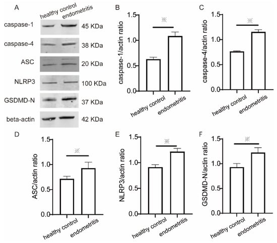 Expression of caspase-1, caspase-4, ASC, GSDMD-N, and NLRP3 in endometrial tissues was detected using Western blot. (A) The expression blots of pyroptosis-related proteins, including caspase-1, caspase-4, ASC, GSDMD-N, and NLRP3, with varying molecular weights. Western blot analysis of (B) caspase-1, (C) caspase-4, (D) ASC, (E) NLRP3, and (F) GSDMD-N in the treatment groups. The experiment was conduced with the endometrial tissues of three healthy cows and the endometrial tissues of three cows with endometritis. ※ p < 0.05.