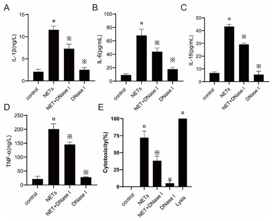 Cytokine production and cytotoxicity of untreated bovine endometrial epithelial cells (BEECs) (control), NET-treated BEECs (NET), NET- and DNase I-treated BEECs (NET+ DNase I), and DNase I-treated BEECs (DNase I). The BEECs were incubated with NETs or DNase I for 16 h. The levels of (A) IL-1β, (B) IL-6, (C) IL-18, and (D) TNF-α in BEEC supernatants were detected by ELISA. (E) The cytotoxicity of BEECs was determined after treatment with NET (500 ng/mL), NET (500 ng/mL) + DNase I (25 µg/mL), or DNase I (25 µg/mL) for 16 h. Lysis provided by LDH cytotoxicity assay kits was used as a positive control. Values are presented as the mean ± SD (n = 3). ¤ p < 0.05 vs. control group and ※ p < 0.05 vs. NETs without DNase I.