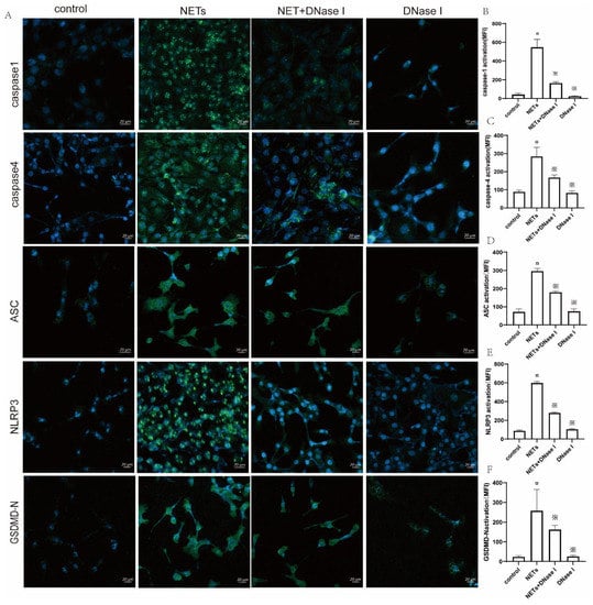 Representative immunofluorescent staining images for caspase-1, caspase-4, ASC, NLRP3, and GSDMD-N in untreated BEECs (control), NET-treated BEECs (NET), NET- and DNase I-treated BEECs (NET+ DNase I), and DNase I-treated BEECs (DNase I). (A) BEECs were subjected to immunofluorescent staining after treatment with NET (500 ng/mL), NET (500 ng/mL) + DNase I (25 µg/mL), or DNase I (25 µg/mL) for 16 h. The nuclei of BEECs were stained with DAPI (blue) and primary antibody (caspase-1, caspase-4, ASC, NLRP3, and GSDMD-N) conjugated with secondary antibody Alexa Fluor®® 488 (green). (B–F) The mean fluorescence intensity (MFI) of activated (B) caspase-1, (C) caspase-4, (D) ASC, (E) NLRP3, and (F) GSDMD-N was detected and analyzed using confocal microscopy and an OLYMPUS Fluoview Ver.1.7c system. Values are presented as the mean ± SD (n = 3). ¤ p < 0.05 vs. control group and ※ p < 0.05 vs. NETs without DNase I; white bar = 20 µm.