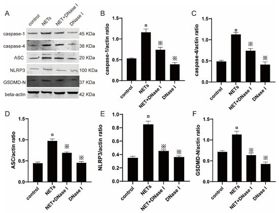 Expression of caspase-1, caspase-4, ASC, GSDMD-N, and NLRP3 in BEECs was detected by Western blotting. (A) The expression blots of pyroptosis-related proteins, including caspase-1, caspase-4, ASC, GSDMD, and NLRP3, with varying molecular weights. Western blot analysis of (B) caspase-1, (C) caspase-4, (D) ASC, (E) NLRP3, and (F) GSDMD-N in the treatment groups (n = 3). The gray values in the figure were analyzed using Image J. Values are presented as the mean ± SD. ¤ p < 0.05 vs. control group and ※ p < 0.05 vs. NET without DNase I.