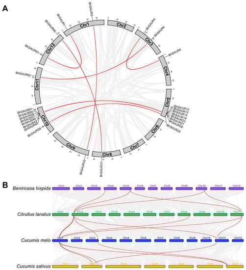 Synteny analysis of the SAUR genes. (A) Synteny analysis of the SAUR genes in wax gourds. Grey lines display the collinear gene pairs in the wax gourd genome. Red lines indicate the collinear BhSAUR gene pairs; (B) gene synteny analysis across the wax gourd (Benincasa hispida), watermelon (Citrullus lanatus), melon (Cucumis melo), and cucumber (Cucumis sativus). Grey lines display the collinear gene pairs across four cucurbit crop genomes. Red lines indicate the collinear SAUR gene pairs in the gene clusters.
